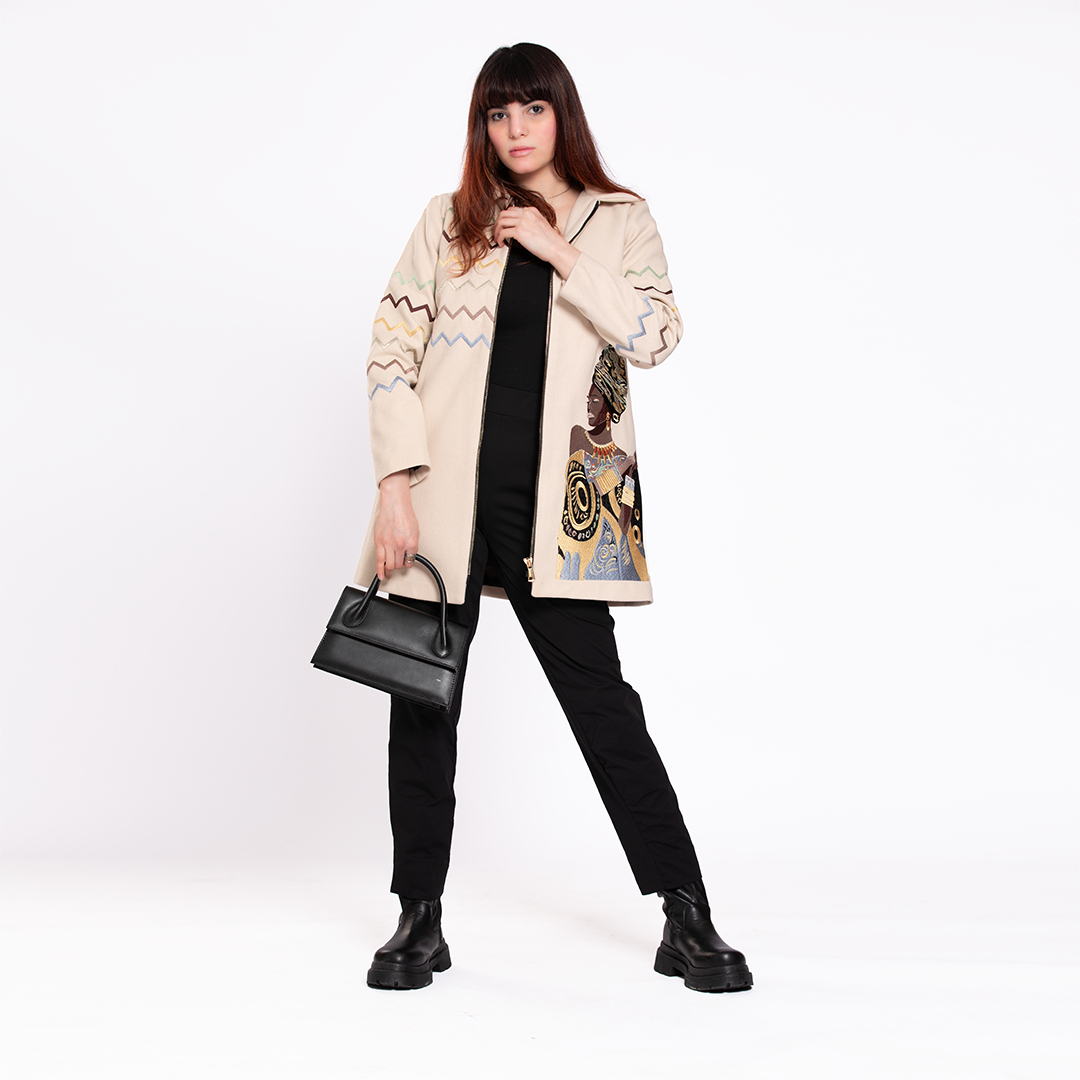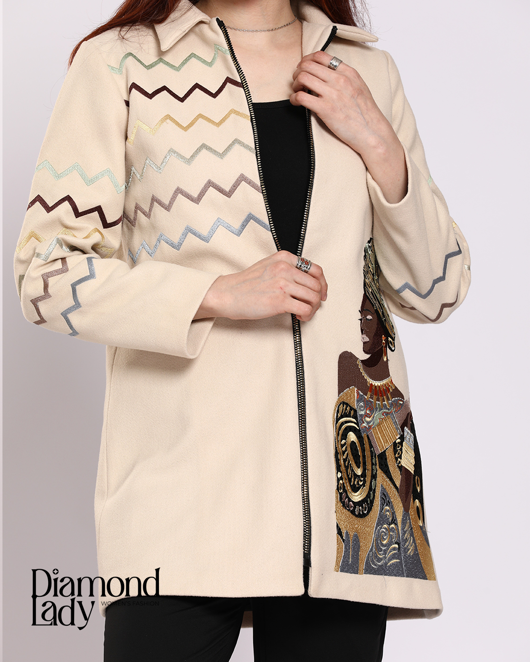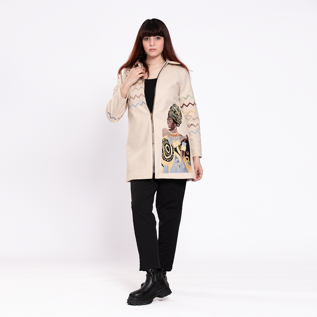 جاكت بيج صوف مبطن ستان مطرز بخيوط ملونة على شكل بنت إفريقية
