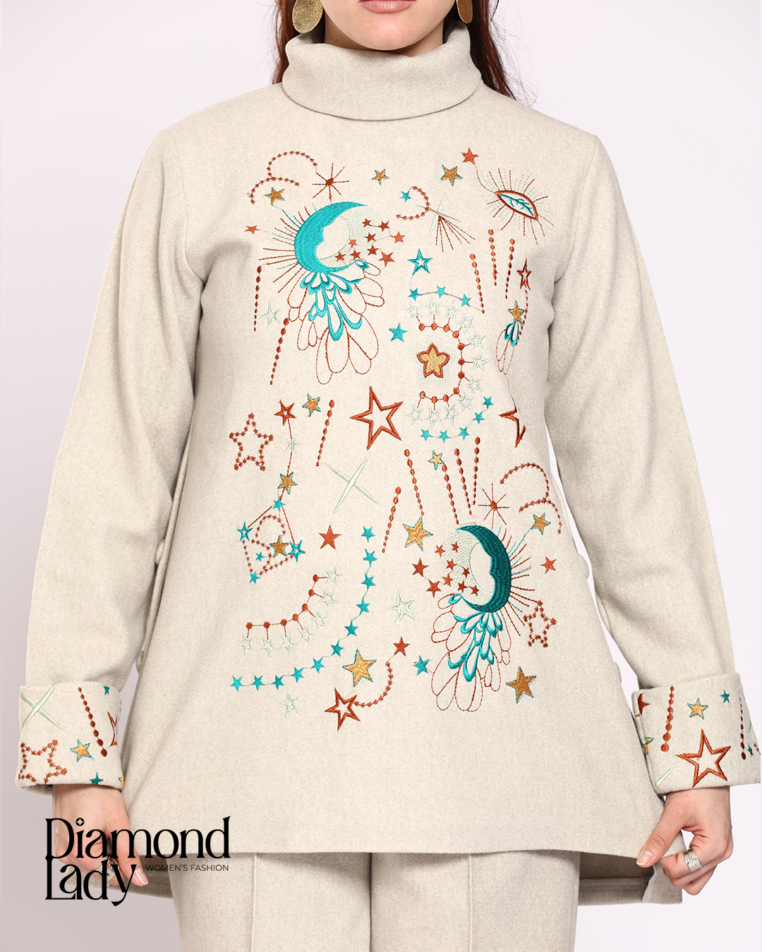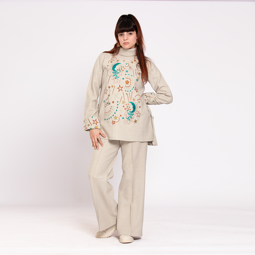 سوت بيج صوف كاملة برقبة مطرزة بخيوط ملونة