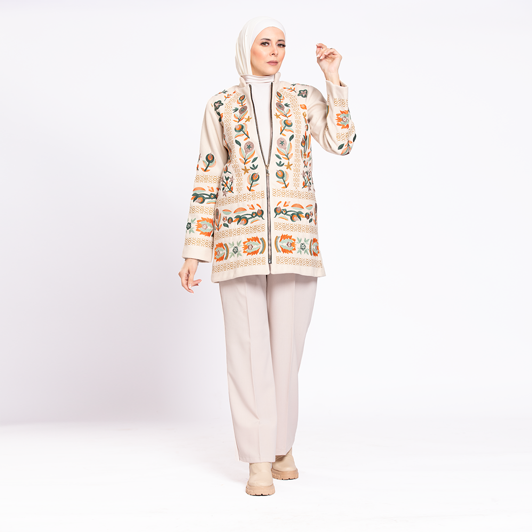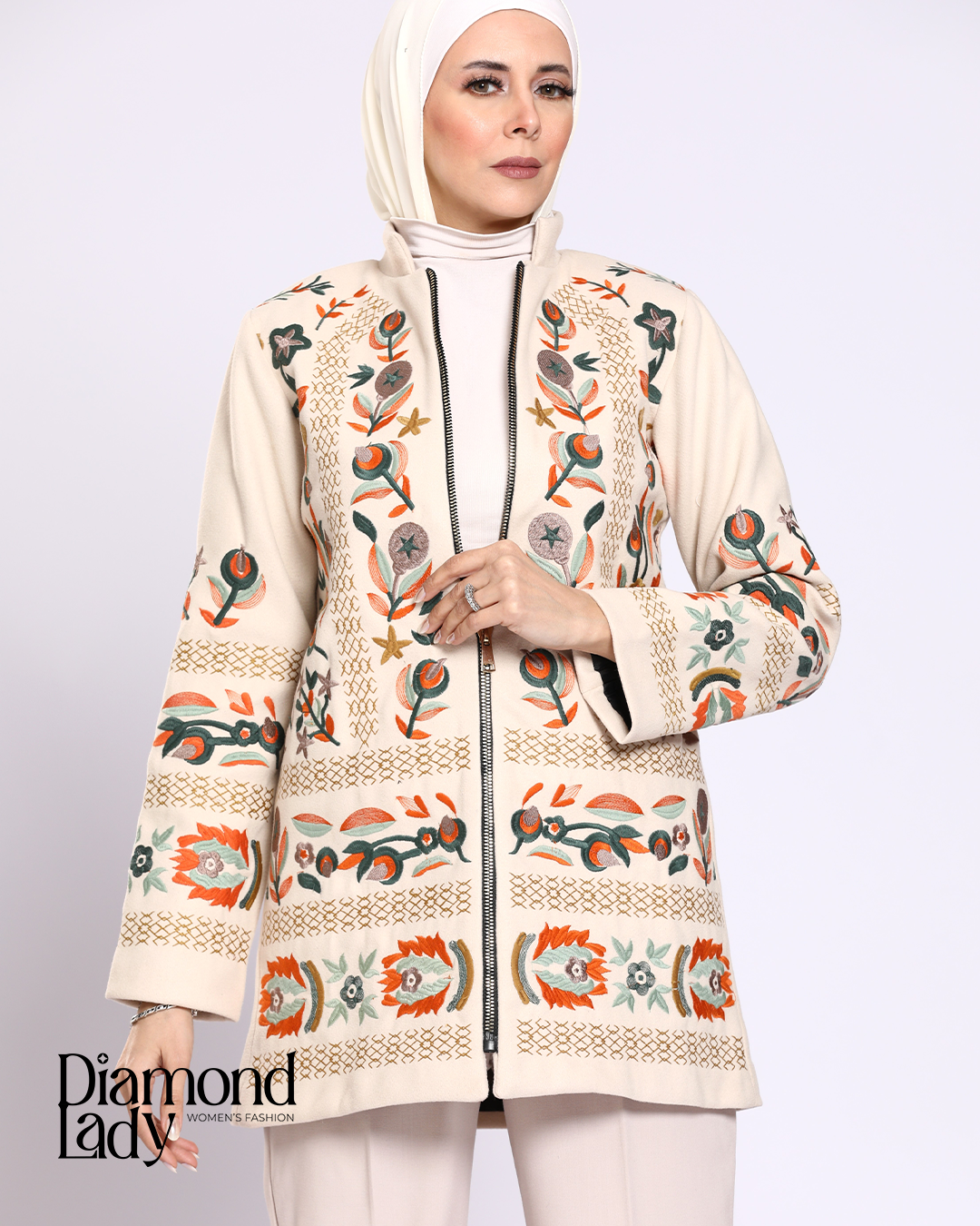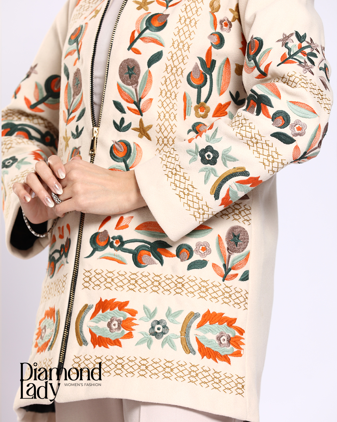 جاكت بيج صوف قصير مبطن ستان ومطرز بخيوط ملونة على شكل زهور