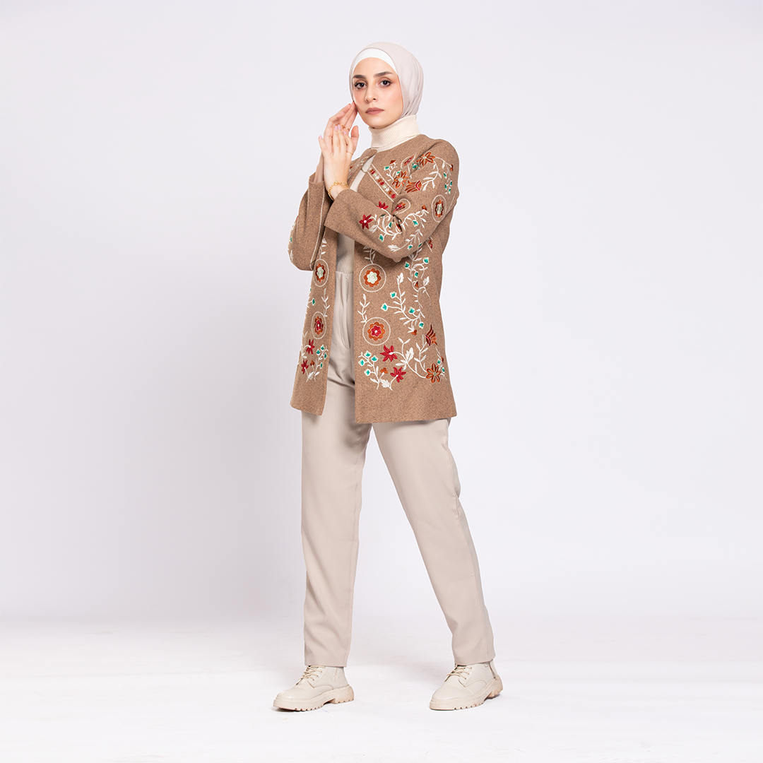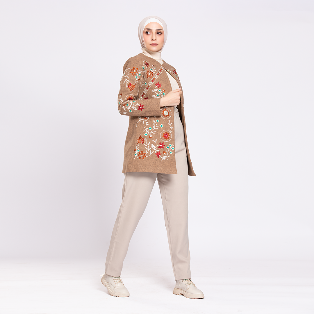 جاكت بنى فاتح قصير صوف مبطن ستان مطرز بخيوط ملونة على شكل زهور صغيرة