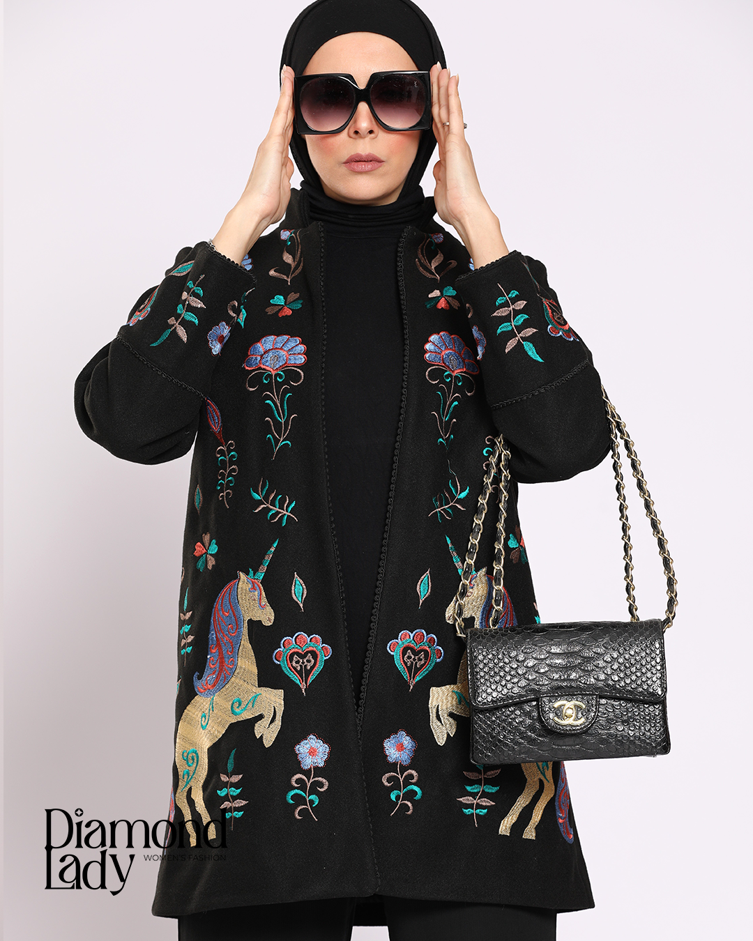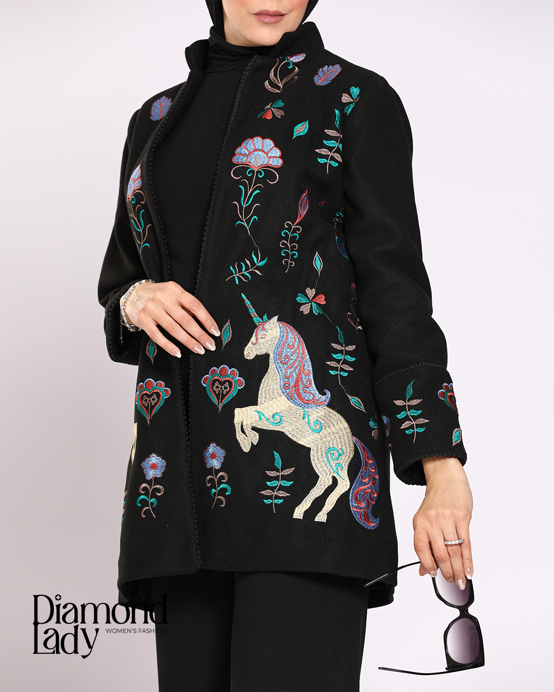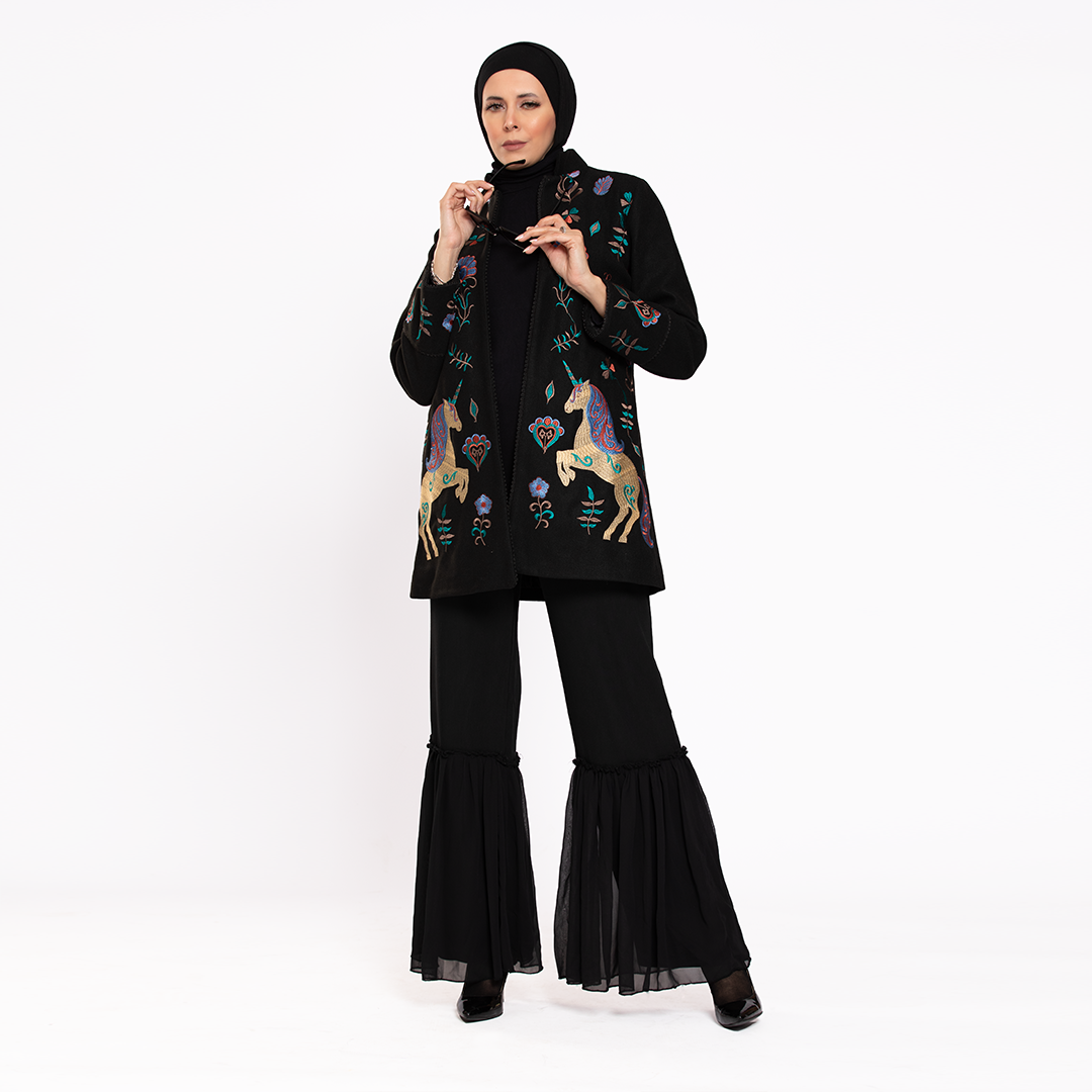 جاكت أسود صوف مبطن ستان ومطرز بخيوط ملونة على شكل وحيد القرن