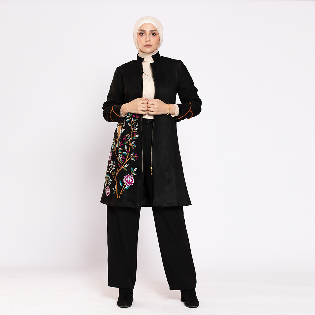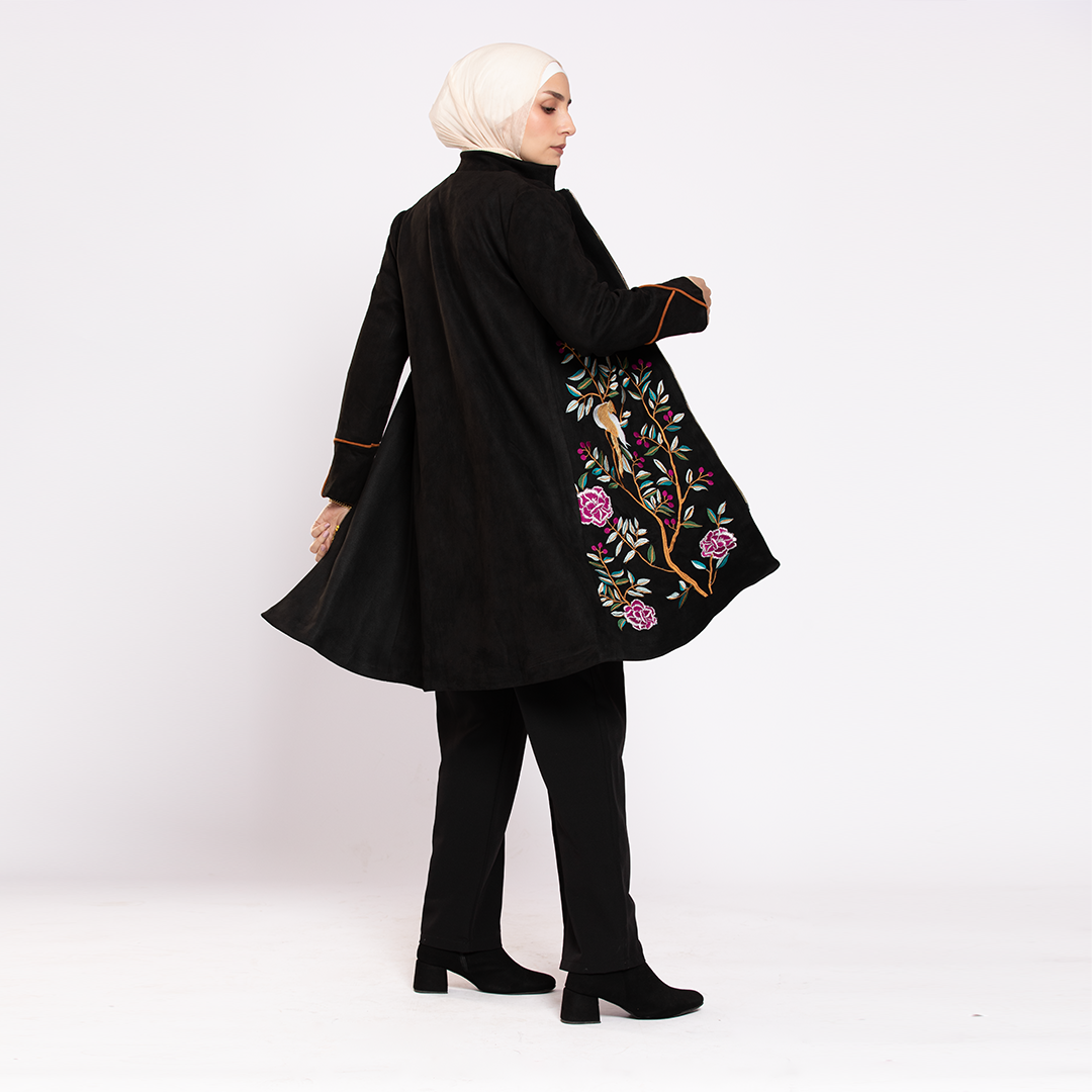 جاكت أسود طويل شمواه مطرز بخيوط ملونة على شكل زهور كبيرة